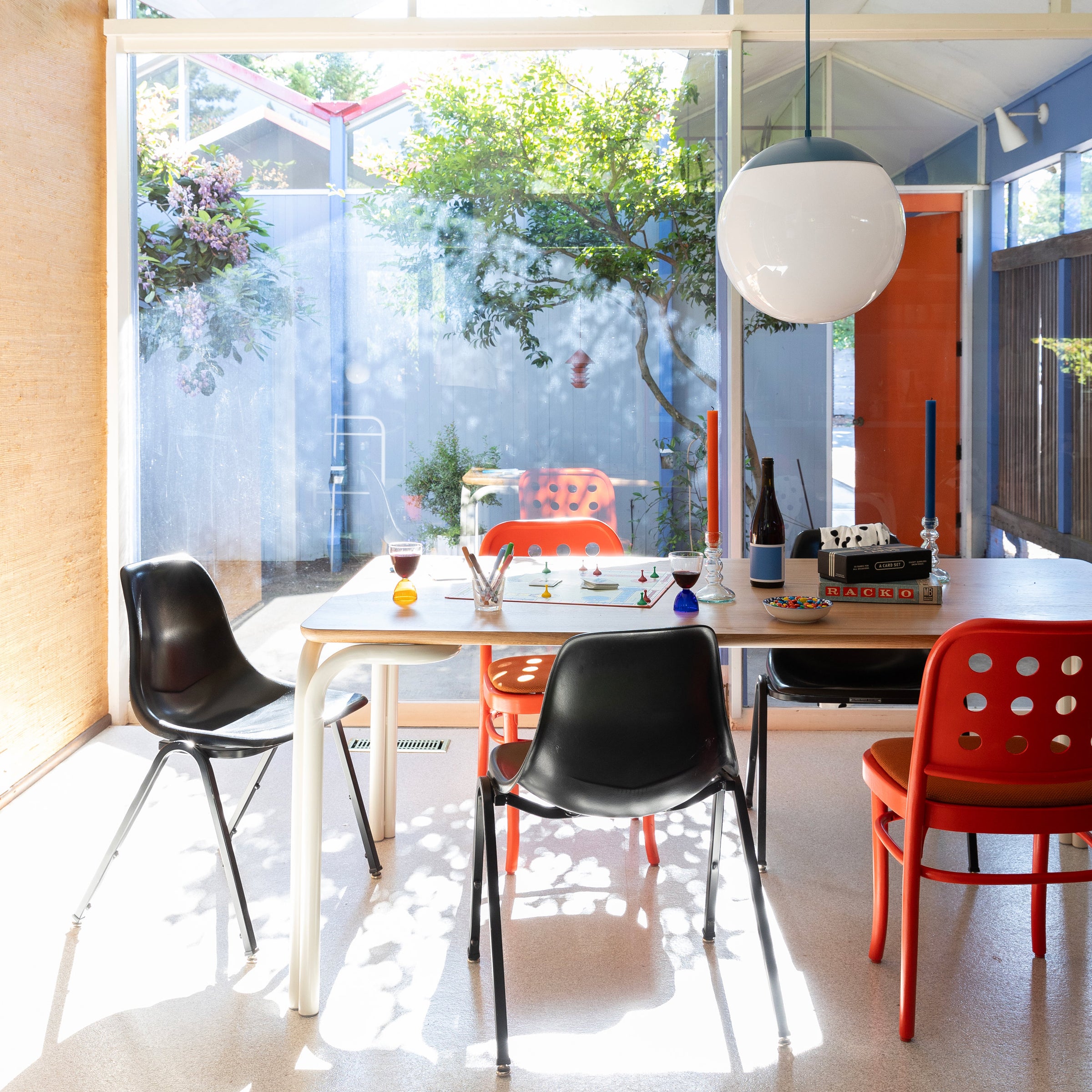 If you're feeling adventurous and want to create a vibrant and energetic space, triadic colors are the way to go. Triadic colors are evenly spaced around the color wheel, such as red, yellow, and blue. When used together, they create a bold and balanced look that is sure to make a statement. We love the use of our Ray Pendant in Bellini paired with shades of deep blue and sunshine yellow in this dining nook.