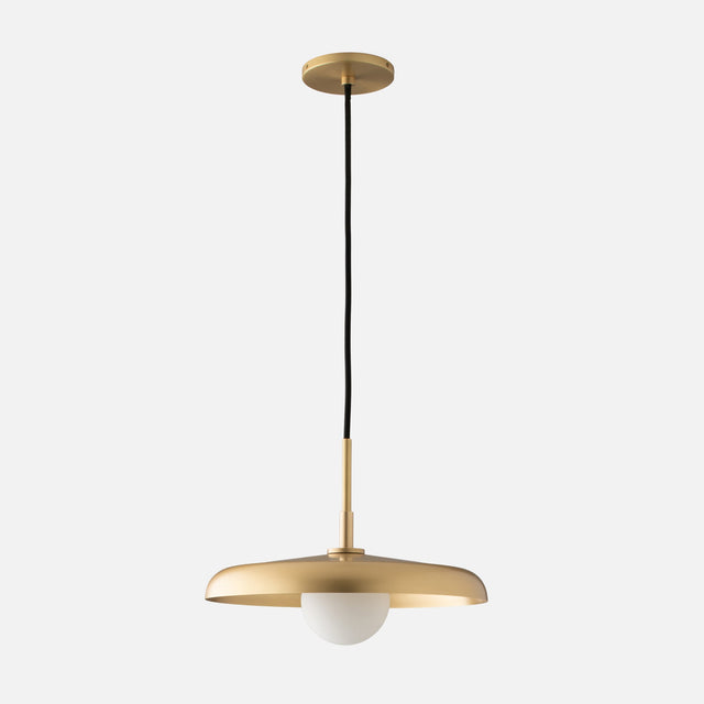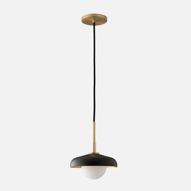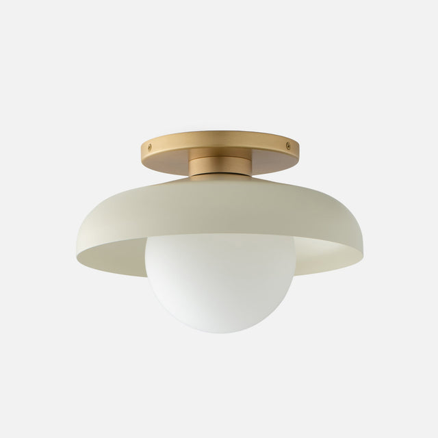 KE: I love the choices we made in terms of sheen and finish. We have this lovely all-brass offering— it’s like candlelight when it’s lit. Then there’s True Black with brass on the inside, so you get that play of the materials with a warm glow. There are also two painted finishes — Shell White and Lichen — both with white on the inside to bounce the light around. All of that is paired with this beautiful matte glass shade.