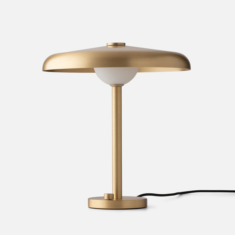 Utility meets elegance in the Caldera 9” Table Lamp, designed by local Portland studio FOLK. A low-profile metal shade and handblown glass diffuser send light downward and outward, while a brass base adds to the thoughtful look. Use the dimmer knob at the base to set just the right mood.